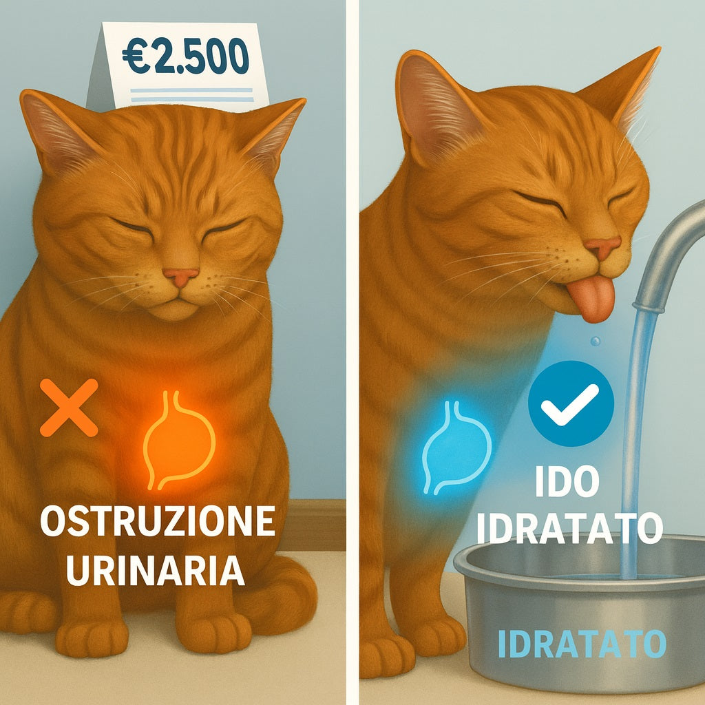 Biofilm → disidratazione → urina concentrata → cristalli → ostruzioni → oltre €2.500 di spese veterinarie